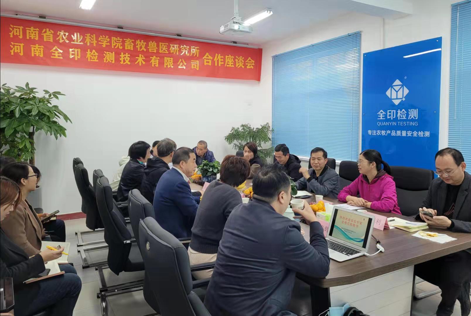 2021年11月1日下午,河南全印檢測技術有限公司與河南省農業科學院畜牧獸醫研究所獸醫研究室合作座談會在全印檢測公司會議室舉行。畜牧獸醫研究所獸醫研究室主任王克領研究員、張立憲研究員、郎利敏博士、李海利博士、方劍玉博士、張青嫻老師、游一老師、鄭萬錄老師蒞臨公司參加會議。全印檢測董事長付立亭、總經理李金榮、質量負責人陳文教授及技術負責人張春霞教授、常選妞教授及員工代表出席了會議。全印檢測董事長付立亭
