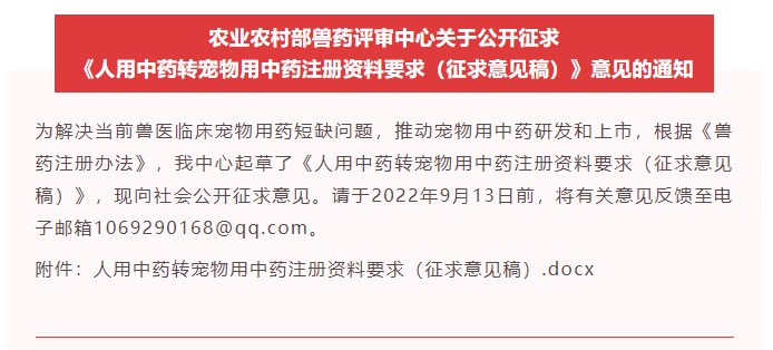 農業農村部獸藥評審中心關于公開征求《人用中藥轉寵物用中藥注冊資料要求(征求意見稿)》意見的通知為解決當前獸醫臨床寵物用藥短缺問題,推動寵物用中藥研發和上市,根據《獸藥注冊辦法》,我中心起草了《人用中藥轉寵物用中藥注冊資料要求(征求意見稿)》,現向社會公開征求意見。請于2022年9月13日前,將有關意見反饋至電子郵箱1069290168@qq.com。附件:人用中藥轉寵物用中藥注冊資料要求(征求意見