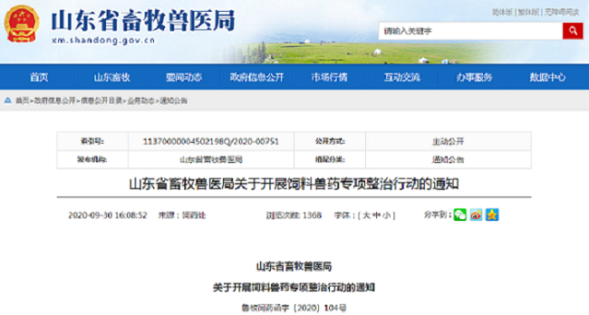 山東省畜牧獸醫局關于開展飼料獸藥專項整治行動的通知魯牧飼藥函字〔2020〕104號各市農業農村局(畜牧獸醫局)、畜牧獸醫中心:為落實獸用抗菌藥物減量、藥物飼料添加劑停用相關政策,規范飼料原料標簽和自配料使用等突出問題,保障飼料和畜產品質量安全,定于10—11月份在全省開展一次飼料獸藥專項整治行動,現將有關要求通知如下:一、專項整治行動內容(一) 飼料原料專項整治1、核查飼料原料標簽是否符合《飼料原